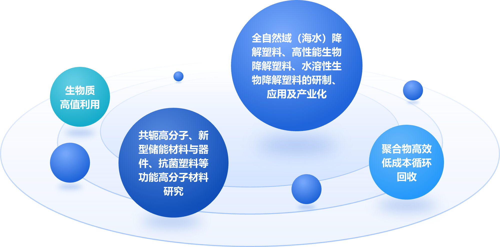 主要研究方向包括:全自然域(海水)降解塑料、高性能生物降解塑料、水溶性生物降解塑料的研制、应用及产业化;生物质高值利用;聚合物高效低成本循环回收;共轭高分子、新型储能材料与器件、抗菌塑料等功能高分子材料研究。