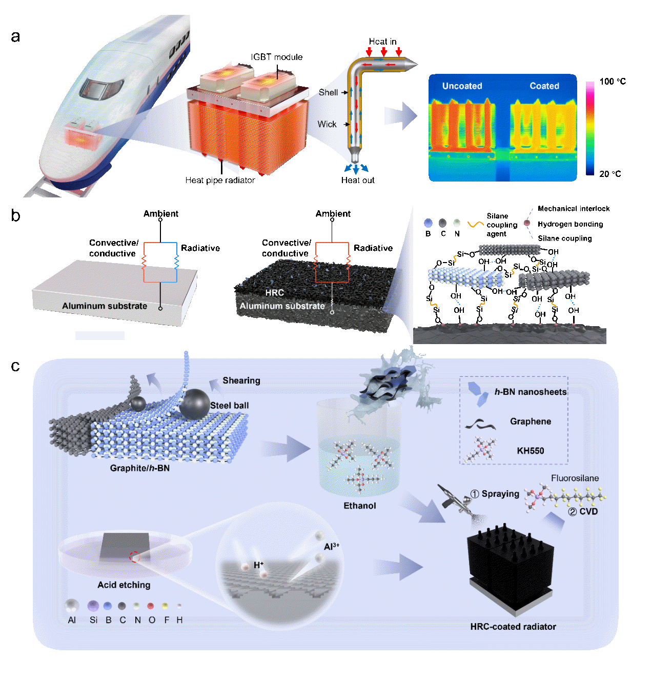 图1. HRC的应用场景和制备。a) 应用于高速铁路的IGBT功率元件热管散热器示意图。b) 裸铝和HRC涂覆铝表面的热传递以及二维纳米片在刻蚀基板上强粘附的机制示意图。c) HRC涂覆铝热管散热器制备示意图。通过球磨制备石墨烯和h-BN纳米片复合材料,并用硅烷偶联剂改性,同时通过化学刻蚀制备微结构。然后将HRC喷涂到刻蚀的铝热管散热器上。此外,氟硅烷(1H,1H,1H,2H-全氟癸基三甲氧基硅烷)可以通过化学气相沉积(CVD)粘附到涂层上,用于需要自清洁性能的应用。