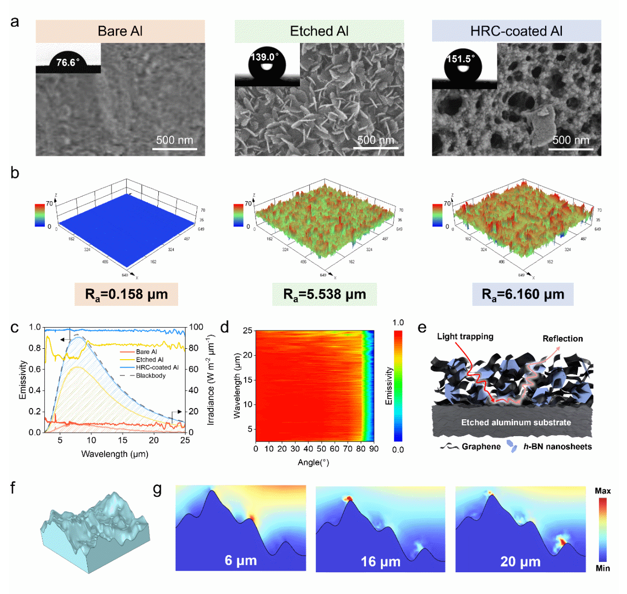 图2. HRC的微观结构和光谱特性。a) 裸铝、刻蚀铝和HRC涂覆铝的SEM图像。b) 裸铝、刻蚀铝和HRC表面的三维扫描模式图像。c) 裸铝、刻蚀铝和HRC涂覆铝的红外光谱发射率和光谱辐照度。d) HRC在入射角为0°至90°范围内的波长依赖性非偏振发射率。e) HRC优异红外吸收/发射特性的示意图。f) 粗糙铝基板的三维几何模型。g) 粗糙铝在波长为6、16和20 μm时的x-z平面电场强度分布。