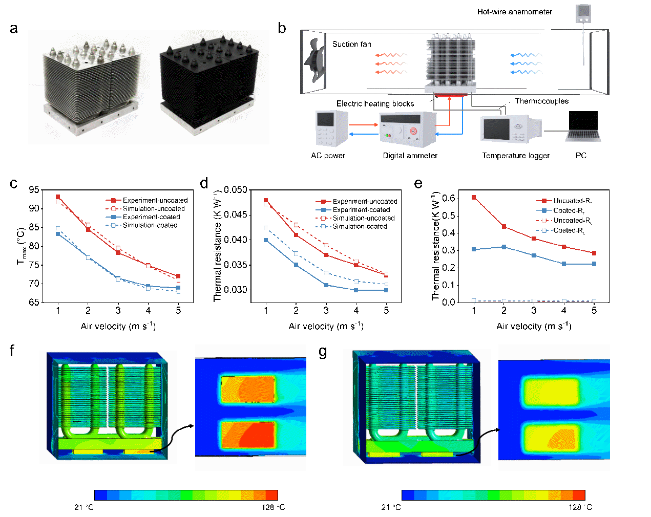 图3. 在1.5 kW热负荷下HRC在热管散热器上的热实验。a) 空白热管散热器和HRC涂覆热管散热器的照片。b) 强制对流场景下热管散热器性能评估的实验装置示意图。c) 不同风速下HRC涂覆和未涂覆散热器基板的实验和模拟最高温度。d) 不同风速下HRC涂覆和未涂覆热管散热器的实验和模拟热阻。e) 不同风速下HRC涂覆和未涂覆热管散热器的模拟辐射和对流热阻。f) 风速为1 m/s时空白热管散热器和热源的模拟温度分布。g) 风速为1 m/s时HRC涂覆热管散热器和热源的模拟温度分布。