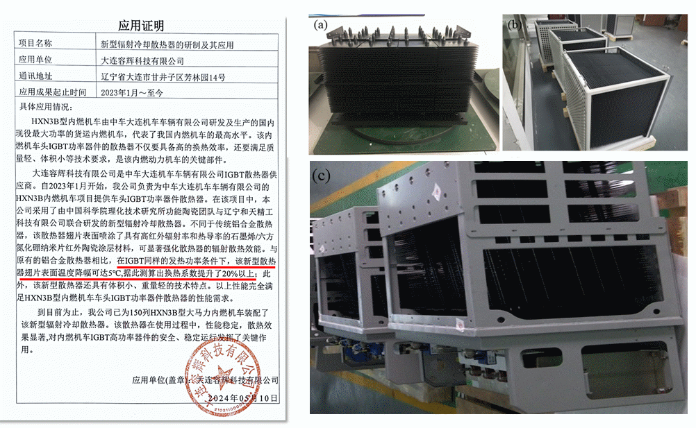 基于上述研究工作成果,项目团队与辽宁和天精工科技有限公司合作研发出了高性能辐射冷却热管散热器,并通过委托大连容辉科技有限公司销售,成功实现了在我国大马力HXN3B型内燃机车IGBT模块热管理方面的规模化工程应用,装车量达到了150辆。HXN3B型内燃机车由中车大连机车车辆有限公司研发及生产,是国内现役最大功率的货运内燃机车,其机车牵引功率可达2700kW,代表了我国内燃机车的最高水平。该内燃机车头IGBT功率器件的散热器功率可达12000W,其散热器不仅要具备高的换热效率,还要满足质量轻、体积小等技术要求,是该内燃动力机车的关键部件。服役情况表明:本团队开发的散热器在使用过程中性能稳定、散热效果显著,对内燃机车IGBT高功率器件的安全、稳定运行发挥了关键作用。上述研究和工程应用成果有望为我国新基建七大领域中量大面广的IGBT功率器件之热管理提供一条“被动辐射冷却”新途径。