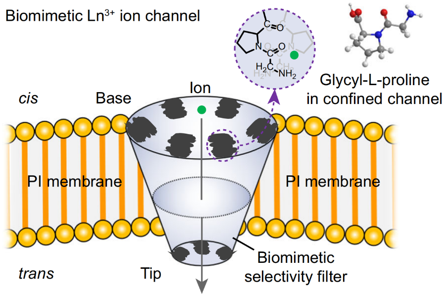 研究聚焦于稀土结合蛋白中的关键脯氨酸片段,将其作为功能分子,利用限域空间原位接枝技术,在国际上首次构建了能选择性传输稀土离子的仿生通道膜,实现了高达46的轻/重稀土离子分离系数,达到国际领先水平。该工作解析了功能分子对稀土离子的选择性络合行为,揭示了独特的“环抱式”络合机制,为稀土离子的绿色分离提供了创新策略。