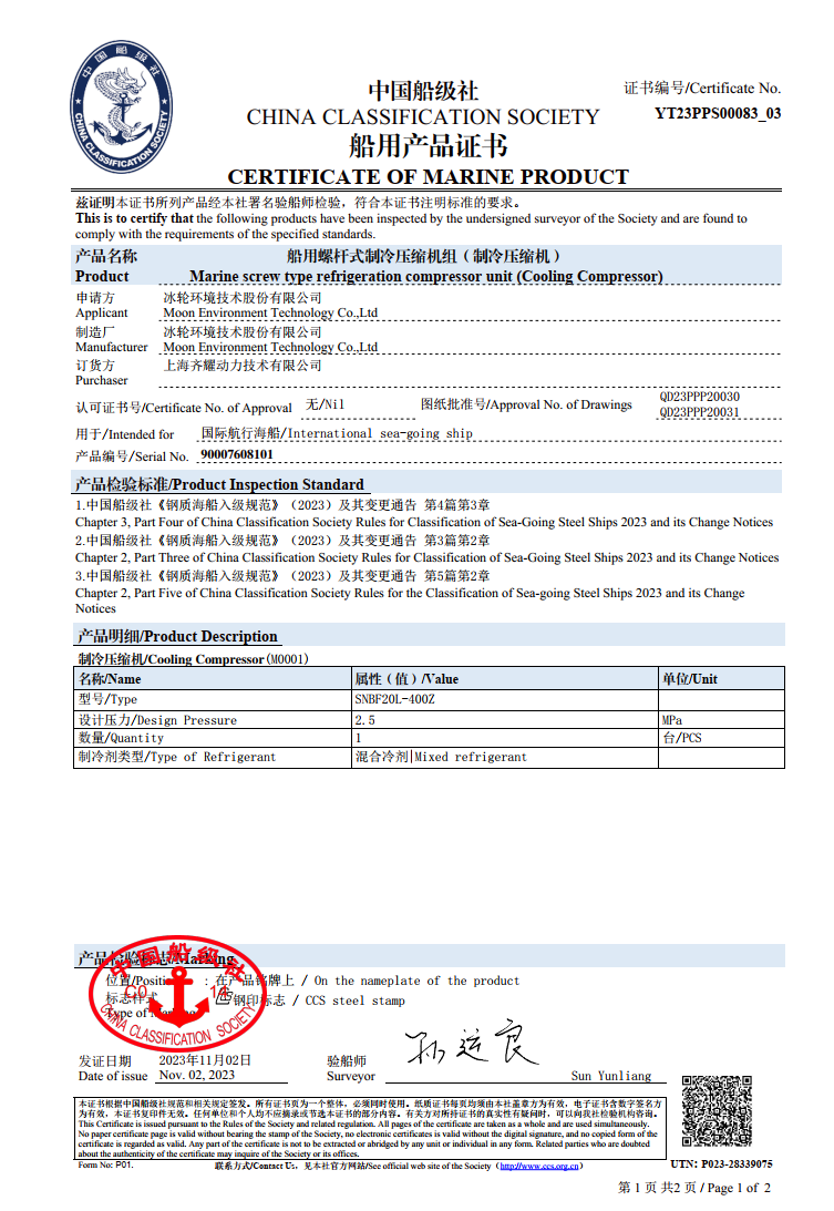 再液化装置作为LNG(Liquefied Natural Gas)运输船、LNG加注船和LNG动力船上的关键核心低温设备,主要利用低温制冷机将LNG蒸发气(BOG,Boil-Off Gas)冷却液化或将LNG液体过冷后送回船舶液货舱,这样既避免BOG直接排放引起经济损失和环保问题,又保障了液货舱压力的稳定和安全。为实现LNG船用再液化装置的国产化应用,理化所混合工质制冷技术团队联合齐耀动力技术团队聚焦关键技术,经过多年联合攻关,成功研发1t/h和1.5t/h LNG船用混合工质型再液化装置,装置采用理化所具有自主知识产权的半封闭油润滑螺杆压缩机驱动的深冷混合工质节流制冷技术,同时参与起草相关国家标准和行业标准。2024年,1t/h LNG船用混合工质型再液化装置完成了关键模式运行、变工况运转等多项性能试验验证,顺利通过中国船级社(CCS)的认证,该装置在40℃高温环境下进行多次性能测试,满足设计指标要求,液化性能优于国外公开报道的同类产品。