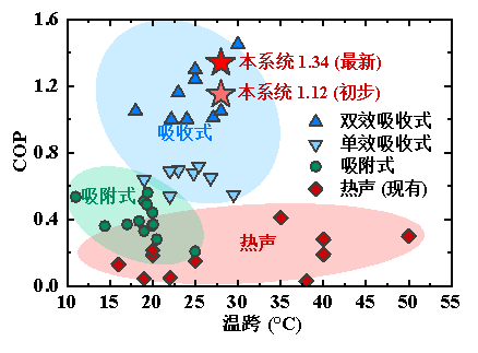 热声驱动制冷机是一种新兴的制冷技术,具有无机械运动部件、工质环保等优点;然而当前其效率较低,其热制冷系数(COP)难与吸收式等主流技术相比。针对这一痛点,提出了一种多场协同的功流旁通型热声驱动制冷机新流程,通过旁通部分发动机入口的功流,在高加热温度下取得了发动机和制冷机良好的功流匹配,实现了压力场-速度场以及功流场-温度场的良好协同,进而大幅度提高了系统的COP。初步实验表明,在标准空调制冷工况下,系统的COP可达1.34,整机相对卡诺效率达到21.4%。在相近的制冷工况下,该COP是以往公开报道的同类型样机最高水平的3.4倍,超越单效吸收式制冷系统,可媲美双效吸收式制冷系统,显著提高了热声驱动制冷系统的竞争力,有望推动热声驱动制冷技术的工程化。