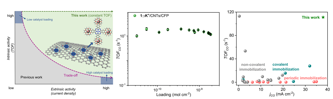高效、高选择性催化CO2还原反应对于实现碳循环,缓解能源和环境问题具有重要意义,为可再生能源以储存在化学键中的形式转化为高附加值的燃料和化工原料提供了方案,是助力实现“双碳”目标的有效途径。目前众多催化体系已展现出可观的CO2还原性能,但每个催化剂的本征活性难以发挥,特别是在高浓度条件下,催化剂的簇集和脱落制约了催化剂活性和稳定性,表现为内在活性(turnover frequency,TOF)与外在活性(如电流密度,J)之间的失衡。