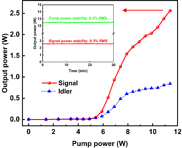 周期晶体阵列变频装置输出功率曲线图。插图:输出功率稳定性测量