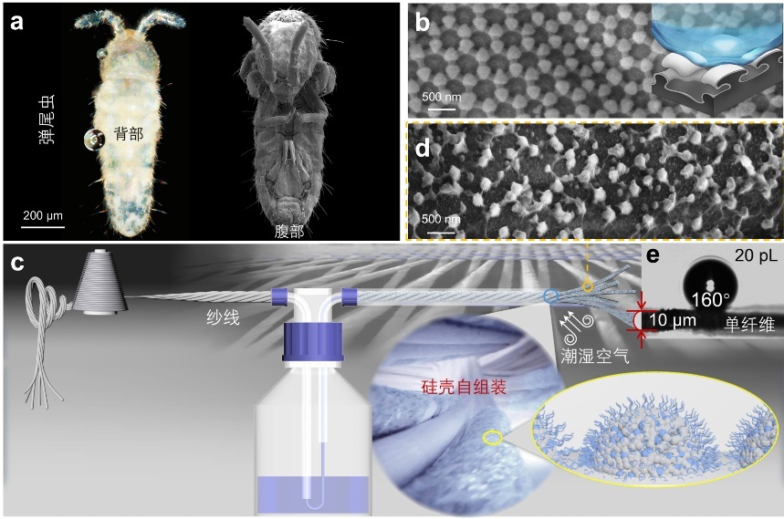 a,弹尾虫;b,弹尾虫表皮SEM图像;c, MARS处理加捻纱线;d,处理后纱线的SEM图像;e,水滴在经MARS修饰后的单根纱线上保持接触角约160°