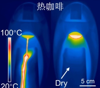 极端温度耐受性实验显示,MARS织物具备优异的热稳定性。无论是刚煮沸的开水或9bar压力胶囊咖啡机挤出的咖啡,均无法破坏其超疏水状态。即使经过160°C高温熨烫处理,其超疏水特性仍丝毫未受影响应。甚至在95°C热水与-196°C液氮的极端冷热循环冲击下,织物性能依旧稳定。