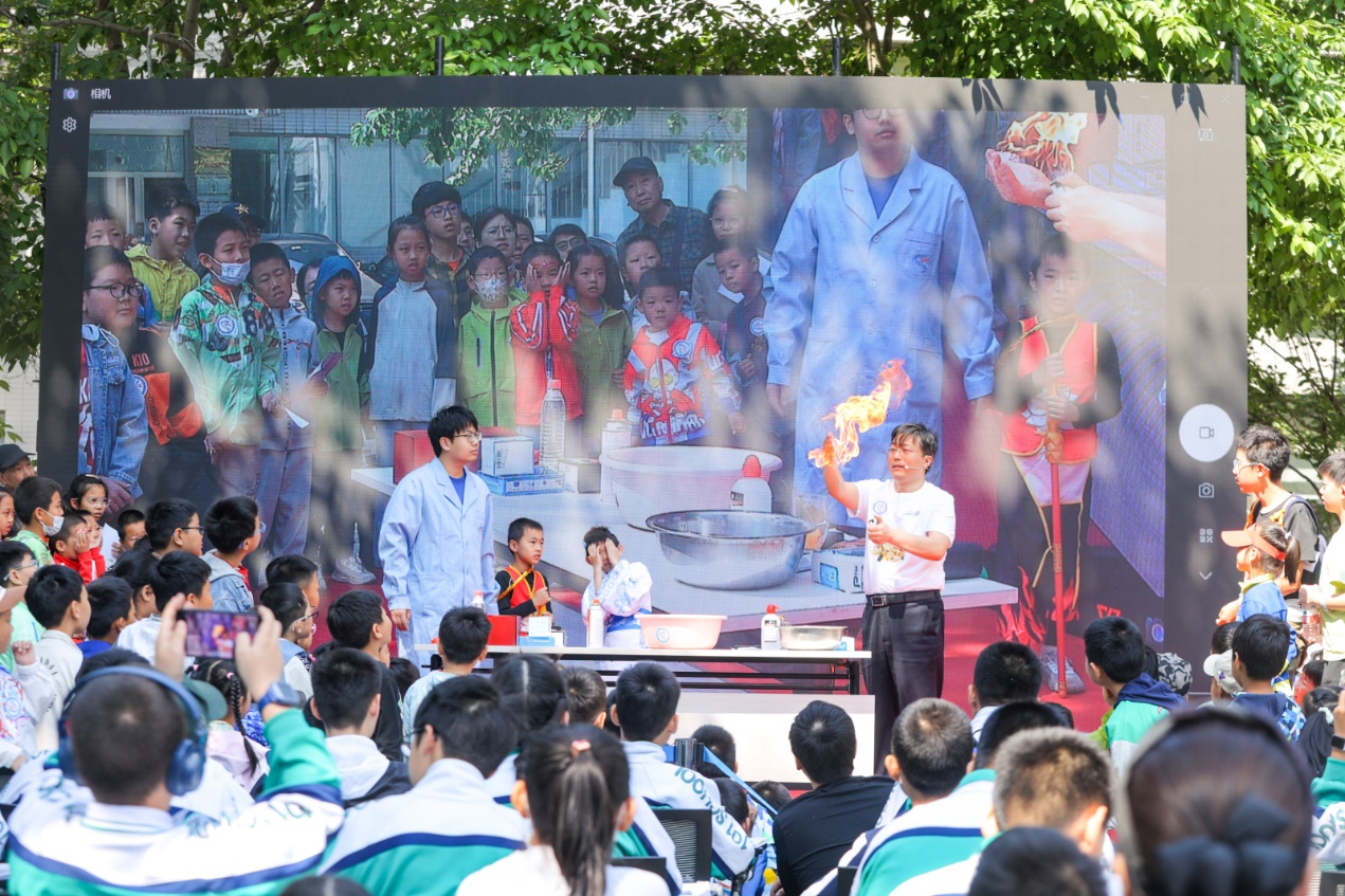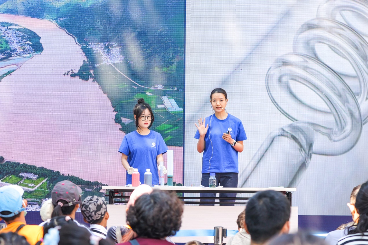 在广场上的“理化嗨剧场”,滚动表演的大型科学实验秀精彩纷呈。主持人魏梦贞、孟庆睿用风趣的“哪吒体”开场,点燃了“理化嗨剧场”的火热气氛。