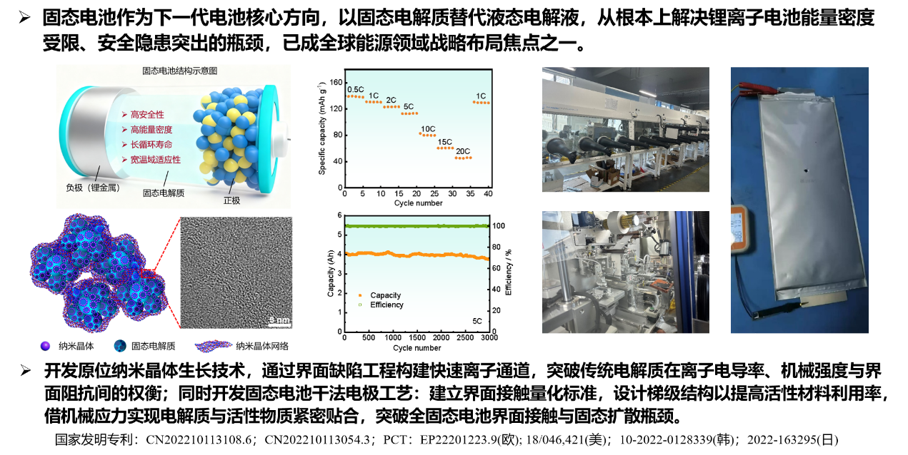 本项目针对于聚合物电解质体系,开发出原位纳米晶体生长技术,通过界面缺陷工程设计,在聚合物体内和活性物质界面处构建快速离子通道,实现了传统电解质在离子电导率、机械强度及界面阻抗间的权衡;同时开发出固态电池干法电极制备工艺,通过建立活性材料-电解质界面接触量化评估标准,设计构建益于固态扩散限制的二维/三维单颗粒与多颗粒结构,调控提高活性材料利用率。同时,借助干法工艺中的机械应力作用,促使电解质和活性物质二者间发生形变并实现紧密贴合,突破全固态电池界面接触与固态扩散双重瓶颈,为高能量密度、长寿命全固态电池产业化提供工艺基础。