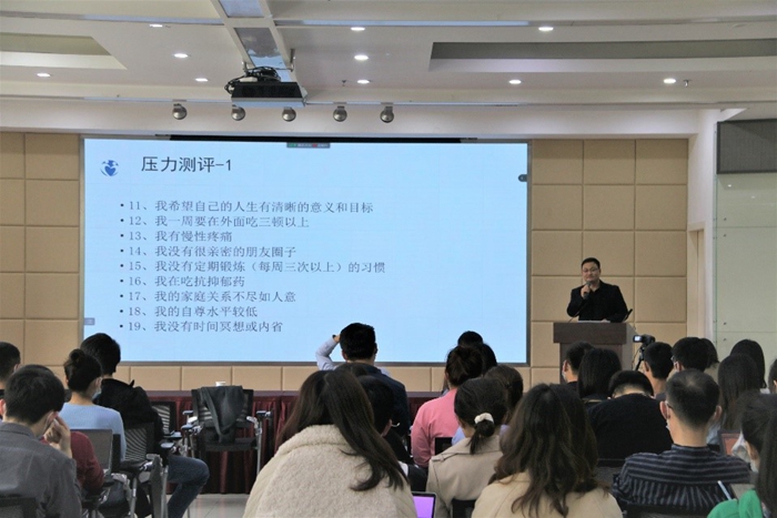 本次报告主要从三个方面对研究生当前压力状态及如何健康应对进行讲解。首先,马老师组织现场同学进行压力自测,根据不同的测试得分,将压力分为不同等级,使同学们知道自己目前的压力水平。随后,马老师从压力的分类、压力的来源、压力的特点等方面介绍压力,让同学们更加深入的了解不同类型的压力。马老师从生理、思维、情绪、行为方面的变化详细分析了过度压力的表现,并以此引出管理压力的基本策略,给同学们介绍了几种应对压力的方式,希望同学们在未来的学习生活中可以张弛有度、乐在生活。
