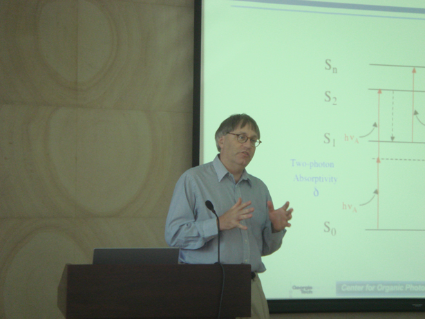 Marder教授着眼于新材料技术的科研方向,就目前发展迅速的微纳蚀刻技术——双光子光聚合微纳加工与热化学法纳米尺度加工等方法进行了重点讲述。Marder的报告由浅入深,先后介绍了双光子吸收的原理与优点以及相关的应用、阳离子双光子光敏剂的在微纳加工中的应用、双光子微纳加工分辨率以及金属离子的双光子还原等研究工作;并结合AFM探针的特点,利用热化学法开展微纳加工,详细讨论了相关材料研究现状。