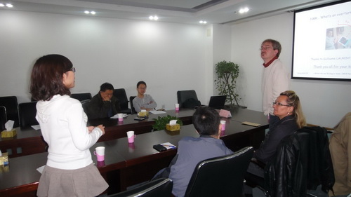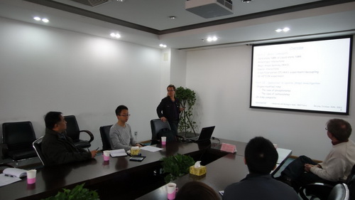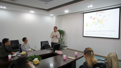Thibaud CORADIN教授作了题为Hybrid Materials for Healthcare and Environmental Remediation的学术报告。报告中,Thibaud CORADIN教授首先介绍了法国科研中心和巴黎第六大学的相关情况,重点介绍了二氧化硅等纳米材料的相关应用和研究价值,并对如何采用化学方法改性无机纳米材料做了详细介绍。报告后,双方就无机纳米材料改性聚合物基复合材料在国际热核聚变实验堆(ITER)超导磁体绝缘系统上的应用进行了详细讨论。