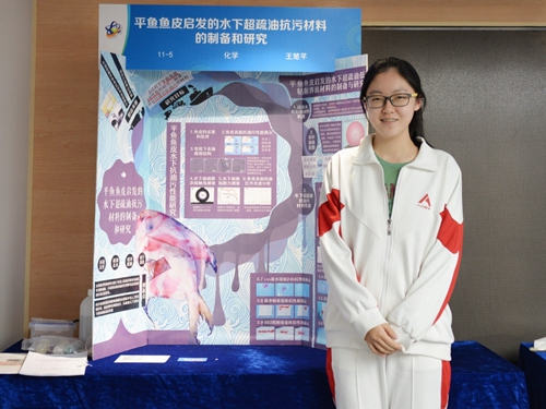 2017年11月3日至7日,由中国科学技术协会、中国科学院、中国工程院、国家自然科学基金委员会和香港周凯旋基金会共同主办的第17届“明天小小科学家”奖励活动在北京大学英杰交流中心成功举行。依托“小小科学家”科普基地平台,在仿生材料与界面科学院重点实验室青年科研人员指导下,中国人民大学附属中学高中三年级学生王楚芊同学完成的题为《平鱼鱼皮启发的水下超疏油抗污材料的制备和研究》的科技作品入围终评赛并获得一等奖。