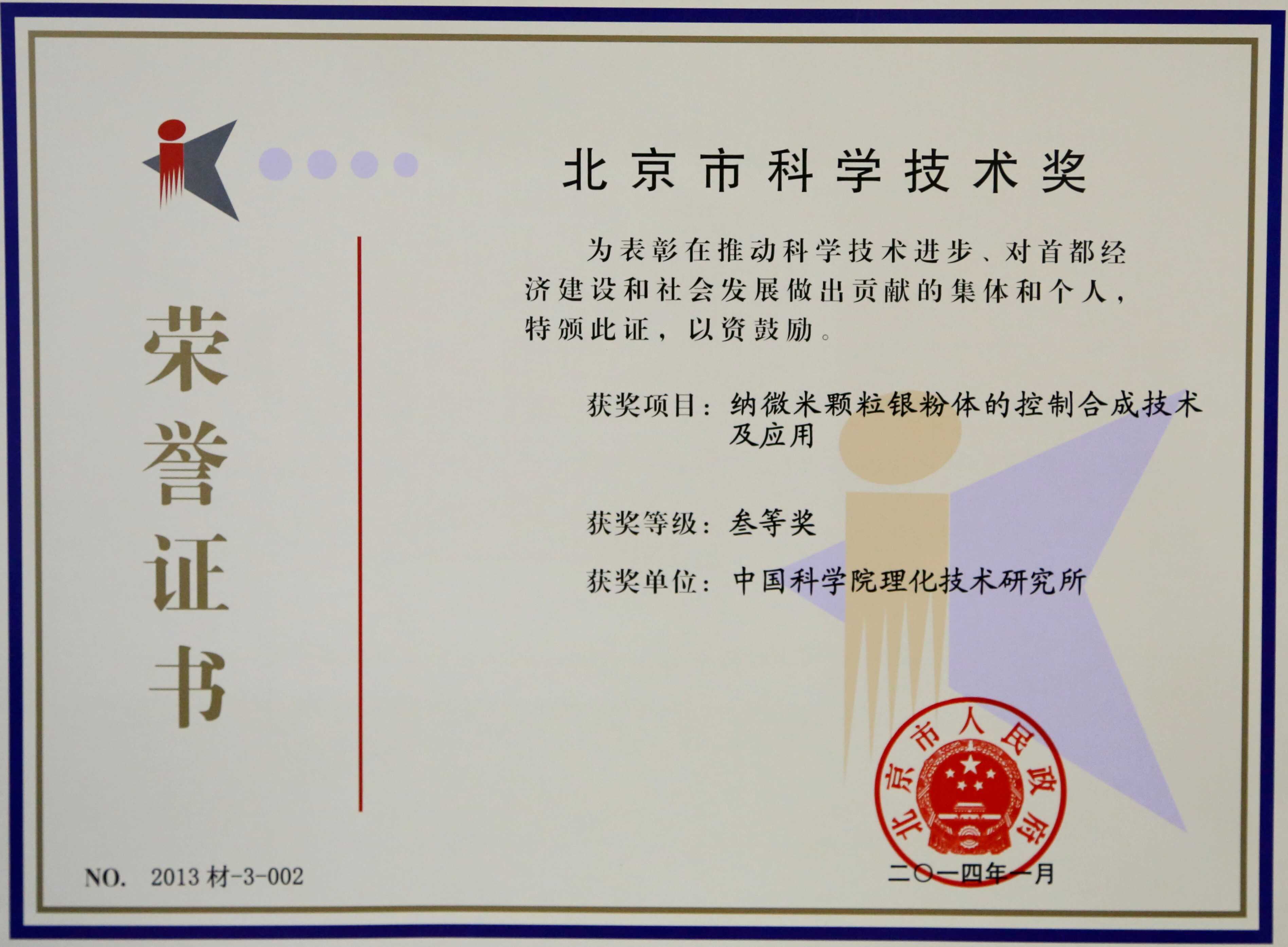 北京市科学技术奖三等奖(2013)——纳微米颗粒银粉体的控制合成技术及应用