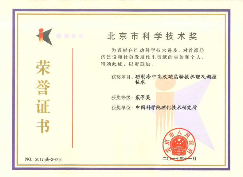 北京市科学技术奖二等奖(2017)—— 磁制冷中高效磁热转换机理及调控技术