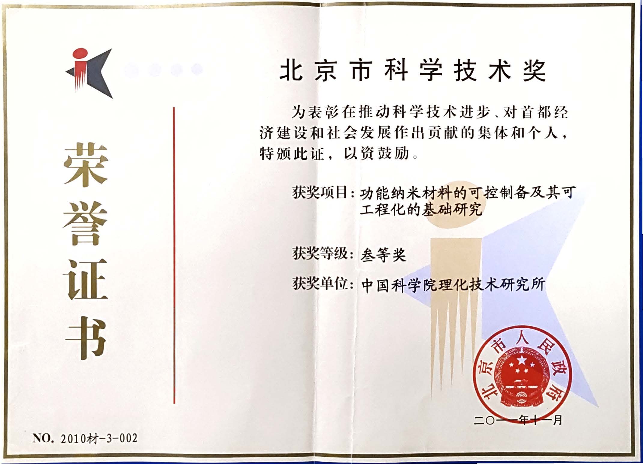 北京市科学技术奖三等奖 (2010)—— 功能纳米材料的可控制备及其可工程化的基础研究