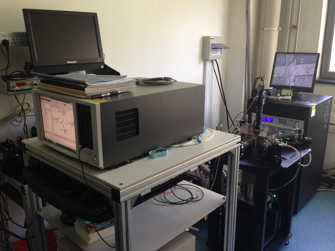 仪器简介:该闭环循环制冷探针台无需制冷剂,能够提供5.6K至670K的变温真空环境。变温范围5.6K~670K,精度1×10-4K,稳定度<±0.03K;真空度可达5×10-4 torr;配备探针BeCu 3, 10, 25μm半径,Wu 25μm半径,应用频率可达1GHz;光学显微分辨率达4μm;标配样品台51×32mm2;高温样品台51mm半径;三同轴样品座51×32mm2(适用于对衬底施加电学调制);电学测量臂4路,0~50MHz电学信号三同轴输出,行程51mm, 25mm, 18mm;光学测量臂1路,350nm~2100nm光学信号SMA输出,行程51mm, 25mm, 18mm;光学激发/探测模块包含:激光光源:450nm (100mW), 532nm (80mW), 660nm (100mW);溴钨灯源:250W,350nm~2500nm,光斑直径80mm;单色仪:200nm~2500nm,分辨率0.1nm;硅光电探测器:300~1100nm,响应时间<10ns;斩波器:SR540 (Stanford Instruments);锁相放大器:SR830 (Stanford Instruments)。半导体特征参数测试仪包含:I-V测试模块:0-200V,电压分辨率1mV,电流分辨率0.1fA,4路通道;C-V测试:1kHz-10MHz,测试电容范围1pF-1mF,精度±0.1%;双通道快速I-V模块:电压范围0-40V,电流范围0-800mA,脉冲输出分辨率20ns。