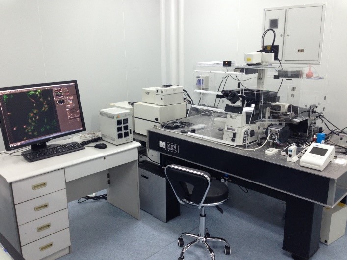 仪器简介:该设备同时集成了激光共聚焦扫描成像功能和超分辨荧光成像功能。在常规荧光三维空间成像的基础上,突破衍射光学限制,能够实现近100nm的空间分辨成像。其中常规激光共聚焦扫描模式:a)物镜倍率有10X,20X,40X,60X,100X;b)激发波长:405nm,488nm,561nm,640nm;c)具备方便小巧的扫描头,允许8帧/秒(512 x 512像素)和100 帧/秒(512×32像素)的高速成像;d)高数值孔径(NA)物镜对宽波长范围自紫外光具有色差校正功能。尤其是LWD 40 ×WI物镜色差校正可达红外范围;e)此系列物镜的NA值为1.49 (使用标准的盖玻片和浸油),配备温度校正环可在23~37°C温度范围对图像质量进行校正;f)同时获得三个通道的荧光,或同时实现三通道荧光与透射微分干涉(DIC)的观察。高品质DIC图像和荧光图像可以叠加,以便进行形态分析;g)单一软件包即可提供各种成像方法,如共聚焦、宽视野、TIRF、光活化,并同时具有图像的处理、分析和呈现的功能。用户可在统一的界面与工作流程中轻松掌握控制不同的成像系统。结构照明超分辨模式:a)物镜倍率:60X,100X;b)空间分辨率≤ 85nm,Z轴为≤300 nm;c)时间分辨率:超高分辨率模式下大于200帧/秒;d)激光波长包括 405nm, 488nm,568nm,642nm;e)在线活细胞培养功能和自动聚焦功能;g)全自动电动载物台,可实现纳米尺度的样品移动;h)功能完备的超高分辨图像处理功能(图像解析运算、三维构建、共定位、能量转移分析、延时拍摄等)。