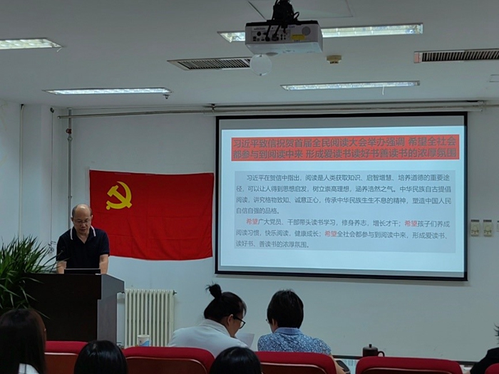 为深入贯彻学习“习近平总书记致首届全民阅读大会贺信精神”,支部宣传委员马望京作了题为《阅读的过去、现在和未来》的报告,回顾人类阅读载体的发展历程,号召大家要学习领会习近平总书记所讲的“希望广大党员、干部带头读书学习,修身养志,增长才干;希望孩子们养成阅读习惯,快乐阅读,健康成长;希望全社会都参与到阅读中来,形成爱读书、读好书、善读书的浓厚氛围”。