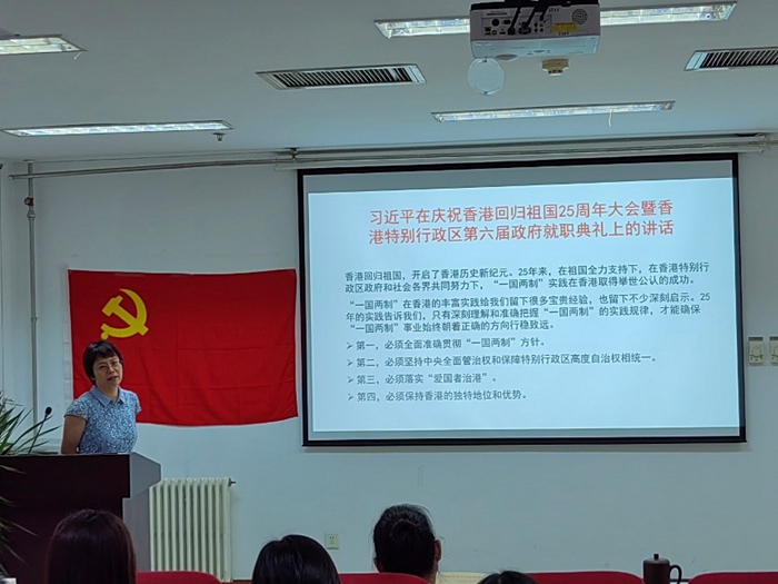 为庆祝香港回归祖国25周年,支部书记赵榆霞讲授了题为《香港回归的历史、成就和展望》的党课,深刻回顾了在1842年至1898年间清政府被迫与英国签订《南京条约》、《北京条约》、《展拓香港界址专条》等条约导致香港逐步被英国占领,此后中英双方经过长达22轮谈判后签署了《中英联合声明》,在1997年7月1日香港正式回归祖国怀抱并成立特别行政区。在香港回归后的25周年里,香港取得了巨大成就,与祖国内地的联系也日益紧密,今后香港会更加繁荣、更加开放、更加和谐。
