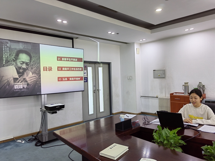 在弘扬科学家精神学习中,慕婷婷向大家介绍了袁隆平院士的生平事迹,袁隆平质朴的生活作风和严谨的治学态度深深感染每一个人,激励全体党员学习并弘扬袁隆平的梦想精神、工匠精神及创新精神。