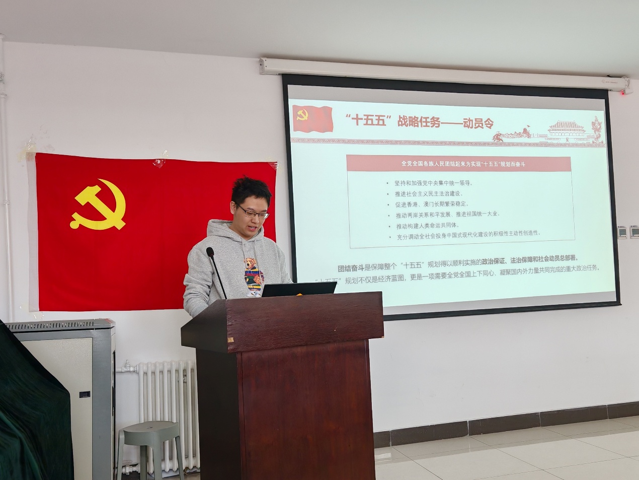支部组织委员周靖韬带领大家学习《中共中央关于制定国民经济和社会发展第十五个五年规划的建议》,详细介绍了“十五五”时期关于发展新质生产力、构建“双循环”新发展格局、民生保障与安全稳定等战略任务,并着重强调了团结奋斗的重要性。