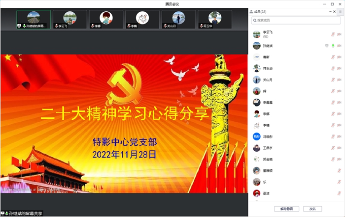 为全面学习党的二十大报告,推动党的二十大精神深入人心,特影中心党支部于11月28日组织开展了学习交流会。会议由支部书记周树云主持,全体党员、入党积极分子、中心科研骨干参加,会议以线上线下相结合的方式开展。