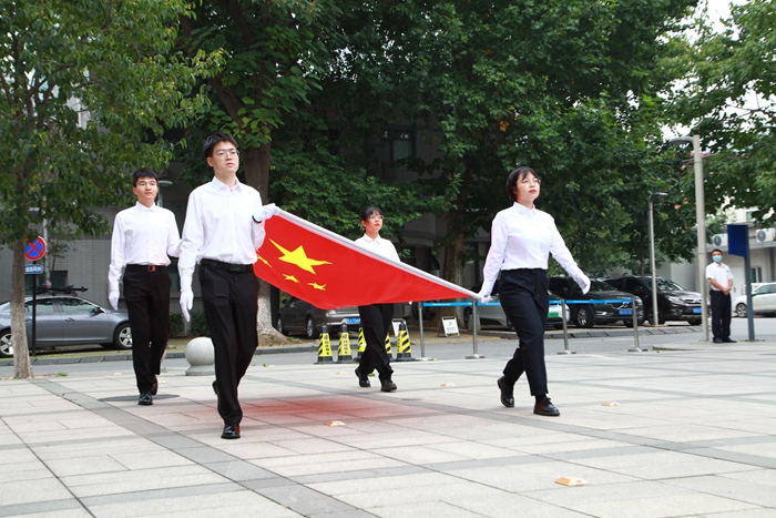 在雄壮激昂的运动员进行曲中,护旗手郭斌、赵俊、刘冉和贾倩倩迈着整齐的步伐,护送五星红旗入场,把国旗庄重地交到升旗手严开祺和王平手中。在庄严的国歌声中,全体师生行注目礼,鲜艳的五星红旗冉冉升起,飘扬在理化所广场上空。
