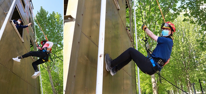 为避免聚集,活动分为4组进行。培训内容包括如何打八字结利用绳索逃生、高空速降演习、如何正确使用灭火器、灭火时如何保护自身安全、封闭场所发生火灾时如何逃生及试穿灭火服等。会员们认真学习及操作每一项培训内容,努力掌握消防技能,也亲身体会了消防官兵的艰辛。