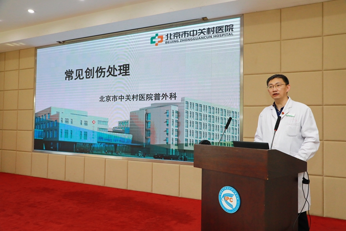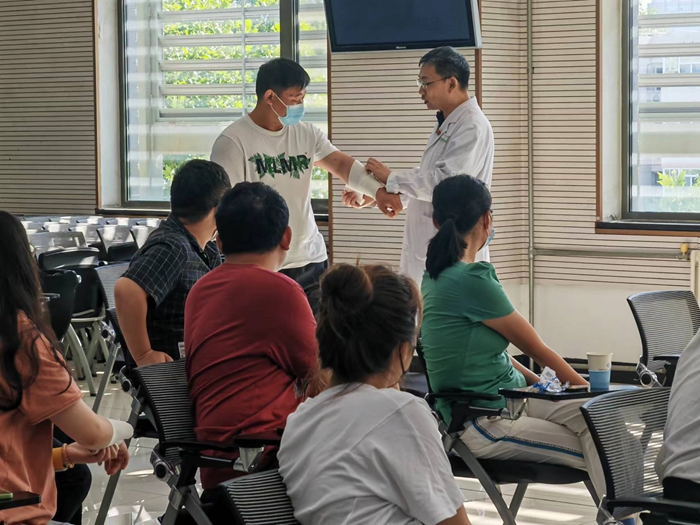 培训还邀请北京市海淀区医学会医疗卫生专业技术鉴定专家、中关村医院普外科主任林延明主任讲授了常见创伤应急处理课程。林主任从常见创伤的应急处理方式、止血的应急处理方法、包扎材料介绍及处理方法、固定的目的及方式方法、搬运的材料准备及要点等方面进行了详尽的讲解,并通过现场演示操作,让参训人员更加直观、熟练地掌握了包扎的方法。最后,林主任通过实例与参训人员进行交流互动,探讨和讲解了具体的处理方法。