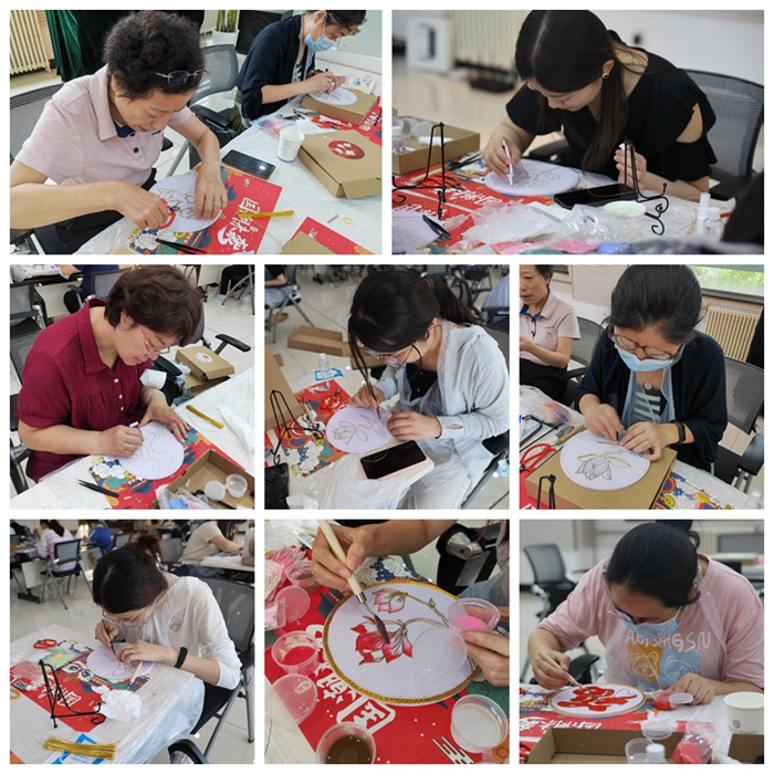活动邀请非遗文化传播人田华为授课主讲老师。她首先向大家介绍了景泰蓝工艺的历史起源、重要地位和主要工艺流程,并向大家展示了精美的景泰蓝国宝作品,让大家感受到景泰蓝传统工艺的魅力。随后,她详细地讲解和示范了景泰蓝画的制作方法、制作步骤和所需材料工具。在田华老师的示范带领下,学员们沉浸其中,按照上胶、掐丝、点彩、喷胶等步骤一丝不苟地制作属于自己的景泰蓝画。助教老师们不时在学员身旁低声指点,或亲手做示范。活动现场静谧和谐,大家都专注于手上的作品,偶能听到做工间歇彼此的赞叹声,一双双惯做科学实验的手,完美诠释着专注、认真、创新、精益求精的工匠精神。老师们纷纷表示,理化所的学员上手快,学得精,不愧是科研院所的高素质人才!活动期间,老师还为进度最快,做工最好的同学颁发了奖品,一度将现场气氛推向高潮。大家深受鼓舞,干劲十足。
