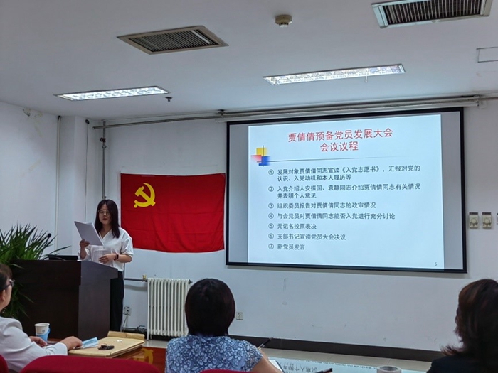 首先,培养对象贾倩倩宣读了她的《入党志愿书》,汇报了自己的基本情况、对党的认识、入党动机等。入党介绍人安振国、袁静介绍了贾倩倩的有关情况,表明意见同意贾倩倩入党。中心主任张敬杰介绍了贾倩倩的培养情况,表明意见同意贾倩倩入党。袁静代表支委会宣读了对贾倩倩的政治审查情况报告。与会党员对贾倩倩能否入党进行充分讨论。经支部大会无记名投票表决,一致同意接收贾倩倩同志为中国共产党预备党员。