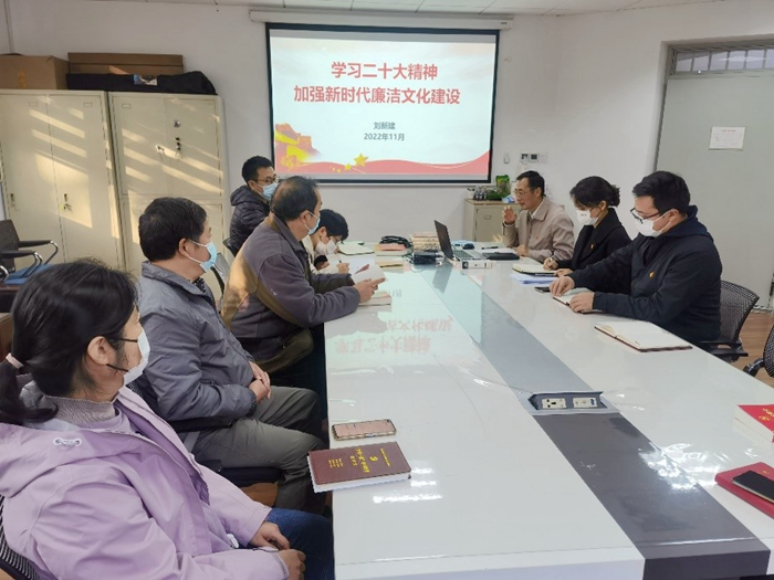 首先,所党委副书记兼纪委书记刘新建为支部党员讲授了一堂题为《学习二十大精神 加强新时代廉洁文化建设》的专题党课。党课以党的二十大报告为引领,深刻学习领会关于廉洁文化建设的新要求;学习《关于加强新时代廉洁文化建设的意见》文件精神;学习习近平总书记关于廉洁文化的重要论述。党风廉政建设是党的建设的重要组成部分,是新时期党的一项重大的政治任务。要通过学习贯彻党的二十大精神,使全体党员在工作中进一步加强党性修养,严守法纪,严以律己,率先垂范,勿忘入党初心,牢记党的宗旨,时刻不忘自己对党做出的庄重承诺,做一名廉洁守纪的理化人。