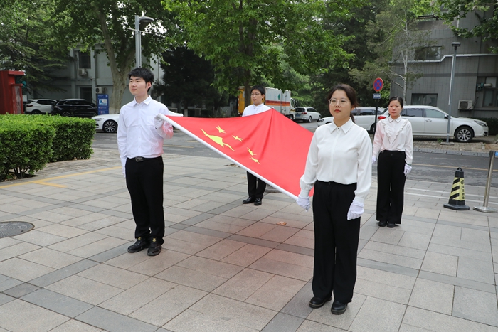 迎着春风和朝阳,护旗手贾倩倩、刘诗洋、翟浩淇、张晓杰迈着整齐的步伐,护送五星红旗入场,把国旗庄重地交到升旗手赵俊和刘强手中。伴随着雄壮激昂的《义勇军进行曲》,在场全体人员高唱国歌,肃立向国旗行注目礼,五星红旗在理化所的上空冉冉升起。