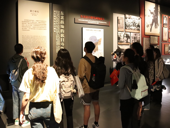 离开抗美援朝烈士陵园,支部成员来到九·一八历史博物馆。硝烟已去,国殇难忘,通过参观,大家仿佛回到了那个民族存亡的危难时刻,深刻感受到共产党人强大的凝聚力和不畏牺牲的奉献精神。展厅一处墙壁展出着中华人民共和国国歌——《义勇军进行曲》,歌词反映着东北抗日联军在各地区与日军战斗的精神,支部成员整齐列队进行集体合唱,歌声引起其他游客的频频驻足,还有小朋友加入了合唱。大家通过歌声激起斗志,并向无数保卫桑梓的中华儿女致以最崇高的敬意。