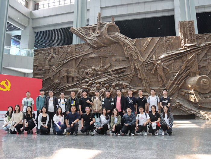 支部成员在中国工业博物馆《铁流凝变》浮雕前合影