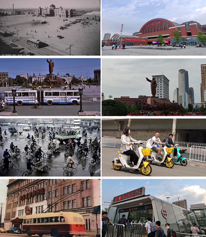 四排左:1951年沈阳的有轨电车;四排右:队员们乘坐沈阳地铁