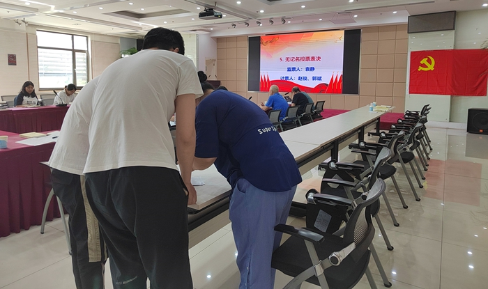监票人袁静、计票人赵俊和郭斌统计投票情况