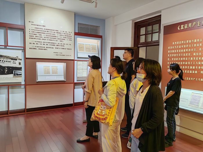 党员同志们参观了“光辉伟业红色序章—北大红楼与中国共产党早期北京革命活动”主题展。主题展共分为“经历近代各种力量救亡图存探索的失败,工人阶级开始登上历史舞台”“唤起民族觉醒,构筑新文化运动的中心”“高举爱国旗帜,形成五四运动的策源地”“播撒革命火种,打造马克思主义在中国早期传播的主阵地”“酝酿和筹建中国共产党,铸就党的主要孕育地之一”和“不忘初心,牢记使命”六个部分。通过1000余幅图片、1350多件文物,全方位、全过程、史诗般重现了中国共产党创建时期北京革命活动的光辉历史,让大家重温了那段救国救民、激情燃烧的岁月。