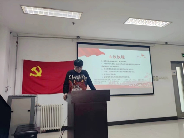 随后,会议讨论了是否接收刘卓然同志为预备党员事宜。发展对象刘卓然宣读了《入党志愿书》,汇报了自己对党的认识、入党动机及个人基本情况。入党介绍人牛鹏飞、张巧玉介绍了刘卓然有关情况,并对其能否入党表明意见。党支部委员会报告了对刘卓然的政审情况。经大会充分讨论、全体党员投票表决同意接收刘卓然同志为预备党员。