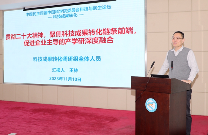 王林研究员代表民盟中国科学院委员会科技成果转化调研组,作了题为“贯彻二十大精神,聚焦科技成果转化链条前端,促进企业主导的产学研深度融合”的调研成果汇报。他首先介绍了本次调研背景,梳理了我国当前科技成果转化的环境和现状,指出了存在的问题。继而从思想层面、法律层面、政策层面、机制层面对问题进行了深入剖析,并在此基础上给出相应政策建议。