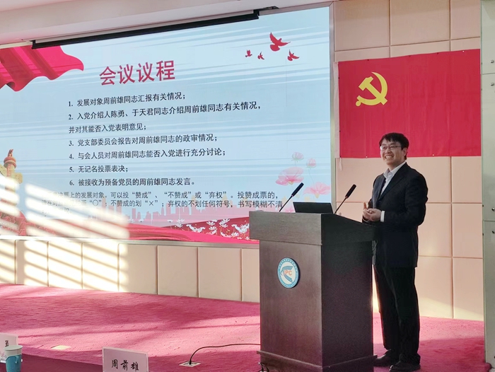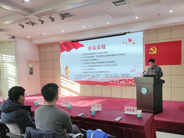 会议讨论了接收科研骨干周前雄同志为预备党员事宜。周前雄宣读了《入党志愿书》,汇报了自己对党的认识、入党动机及个人基本情况。入党介绍人陈勇、于天君分别介绍了周前雄的有关情况,并对其能否入党表明意见。党支部委员会报告了对周前雄的政审情况。经大会充分讨论、全体党员投票表决同意接收周前雄同志为预备党员。刘世雄同志为会议作总结发言。