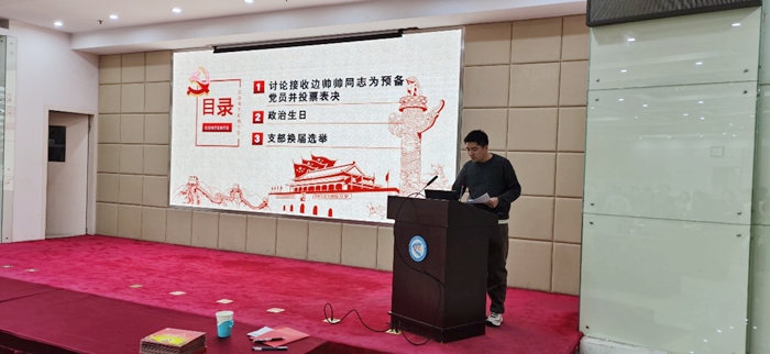 会上,按照组织发展程序,发展对象边帅帅同志宣读了《入党志愿书》,汇报了自己的基本情况、对党的认识和入党动机等。入党介绍人刘卫敏和任昊慧分别介绍了对边帅帅的培养情况,并表示同意边帅帅入党。与会党员对边帅帅同志能否入党进行充分讨论。最后,经支部大会投票表决,同意接收边帅帅同志为中国共产党预备党员。