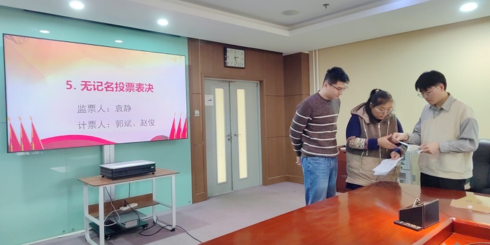 监票人袁静、计票人赵俊和郭斌统计投票情况