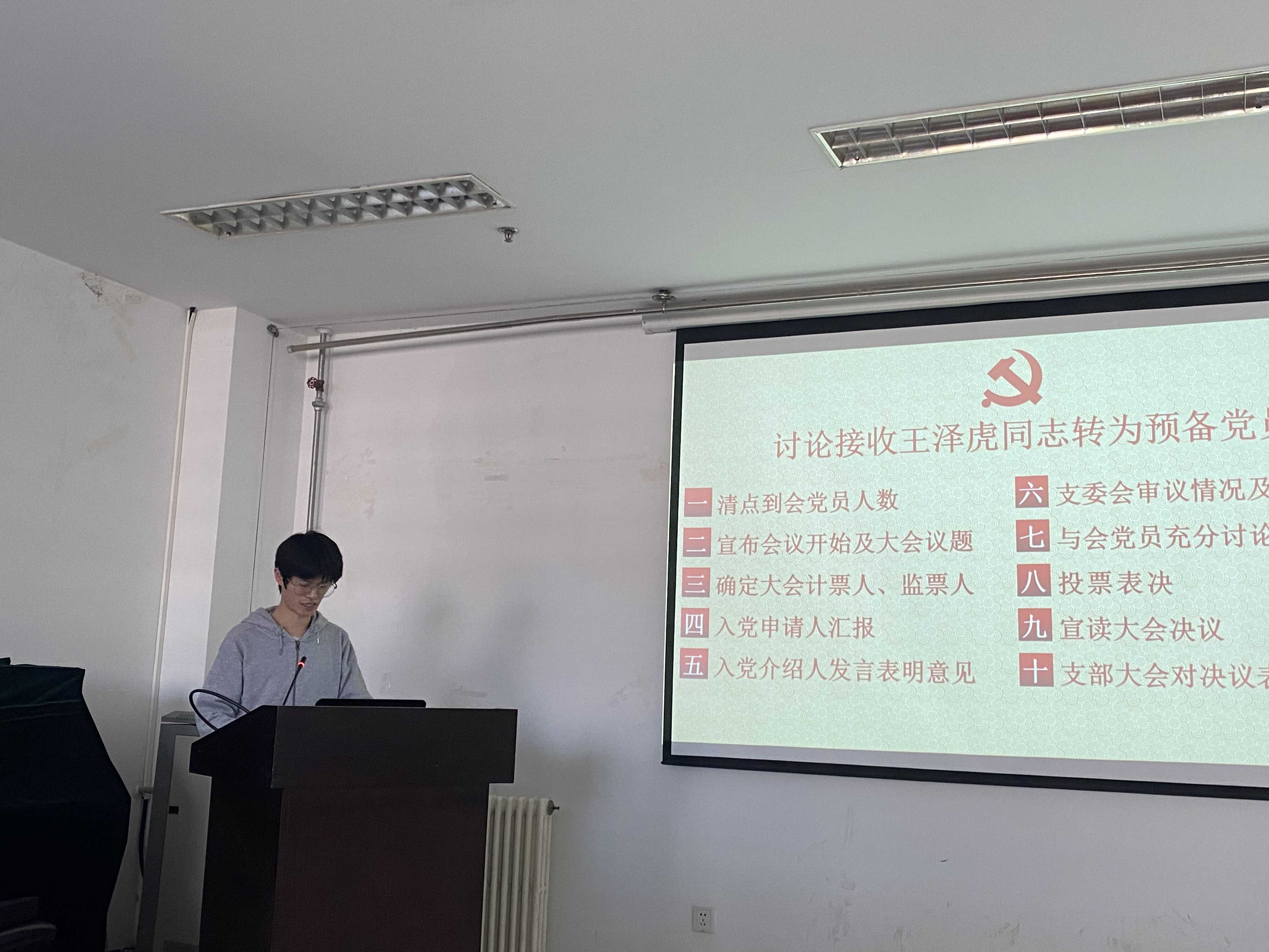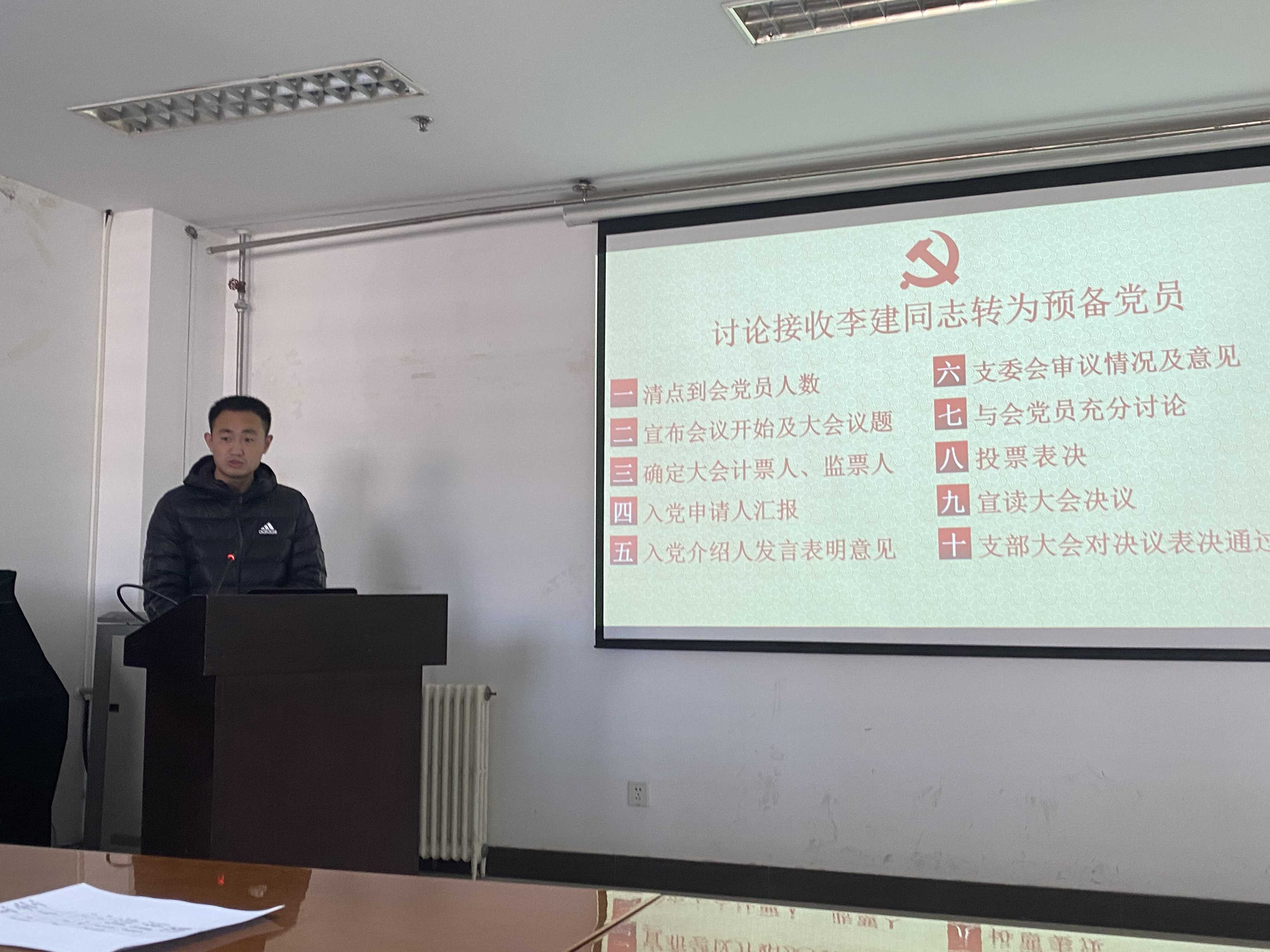 会议还讨论了接收李建、王泽虎同志为预备党员事宜。按照组织发展程序,李建、王泽虎同志分别宣读了《入党志愿书》,并汇报了自己的基本情况、对党的认识和入党动机等。入党介绍人分别介绍了对两位同志的培养情况,并表示同意入党。与会党员对李建、王泽虎同志能否入党进行了充分讨论。经支部大会投票表决,同意接收李建、王泽虎同志为中国共产党预备党员。