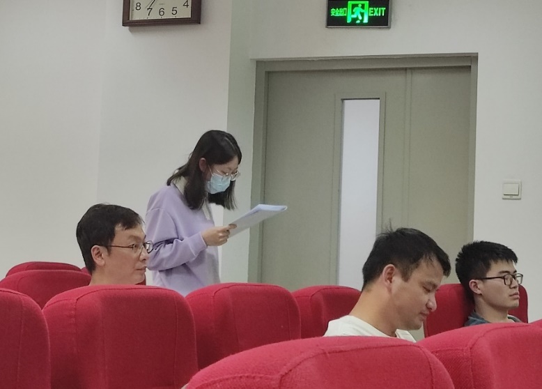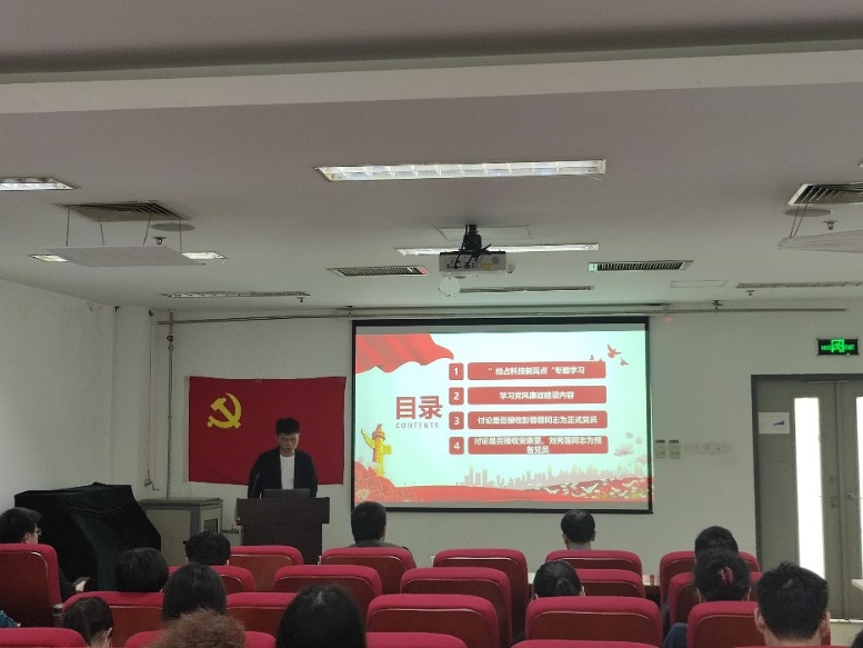 会议讨论了彭蓉蓉同志的转正事宜。支部组织委员周靖韬向大家介绍了彭蓉蓉同志的个人表现及培养情况,经大会充分讨论、全体党员投票表决同意彭蓉蓉同志按期转为正式党员。