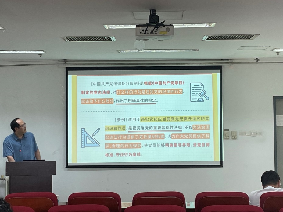首先,支部书记林哲帅带领全体党员深入学习了《中国共产党纪律处分条例》。他通过逐条剖析《条例》的详细规定,以史为鉴,追溯我党纪律教育的光辉历程,强调了传承与弘扬我党纪律严明传统的时代使命。林哲帅从历史纵深与实践维度出发,全面阐释了党内法规的深层含义,详尽解读了《条例》的核心价值、历次修订的历史背景、关键条例及专业术语。通过学习,加深了大家对党内纪律框架的全面理解,也确保了党员们能在日常生活中,特别是在科研领域,坚定不移地遵守党纪国法,展现出高度的纪律性和严谨的专业态度。