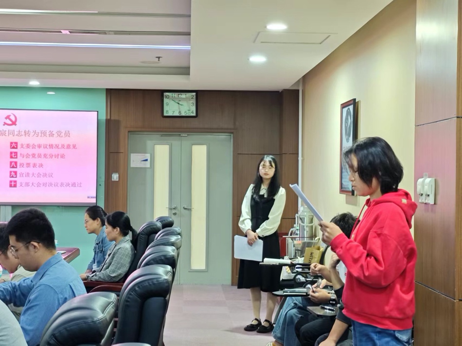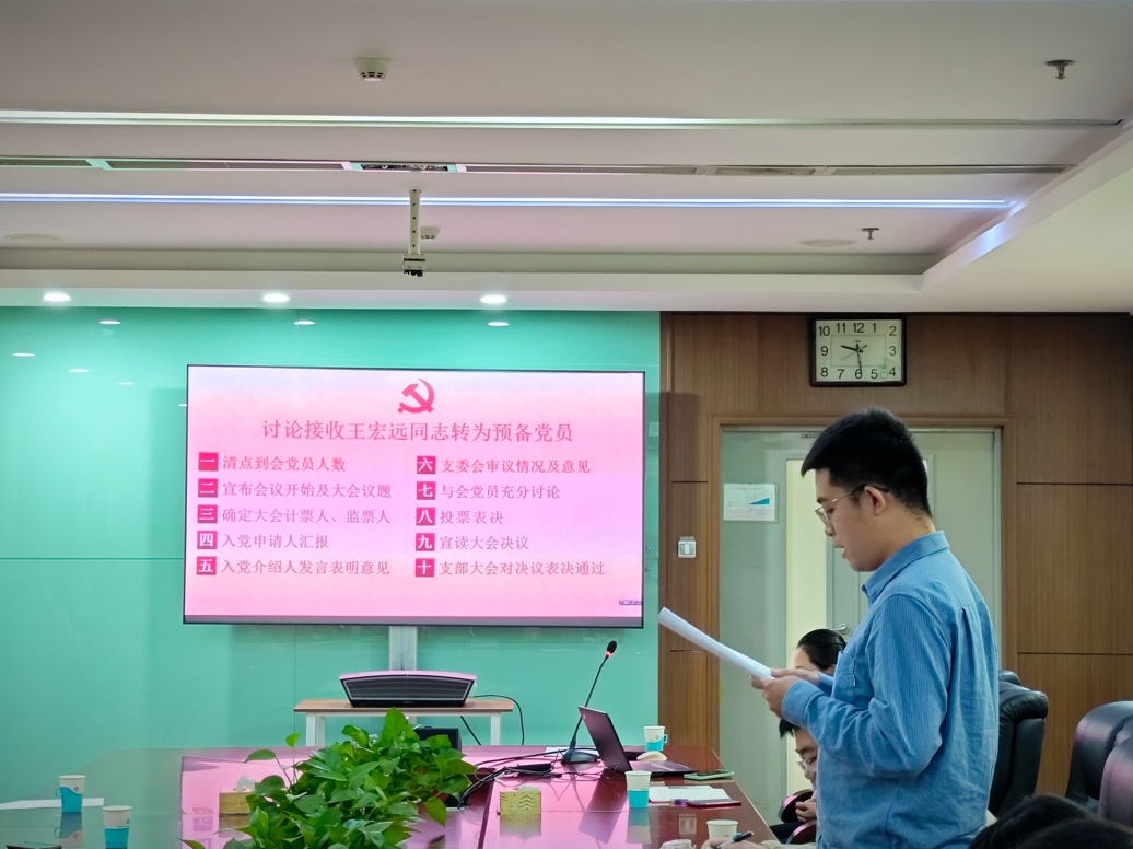 随后,会议讨论了接收王宏远、冯宇宸为预备党员事宜。按照组织发展程序,王宏远、冯宇宸分别宣读了《入党志愿书》,并汇报了自己的基本情况、对党的认识和入党动机等。入党介绍人分别介绍了对两位同志的培养情况,并表示同意他们入党。与会党员对王宏远、冯宇宸能否入党进行了充分讨论。经支部大会分别投票表决,同意接收王宏远、冯宇宸为中国共产党预备党员。