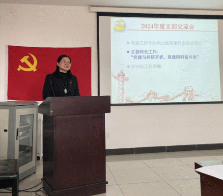 郑美玲就2024年度支部工作进行了总结,重点汇报了2024年度工作计划和上级部署任务完成情况,强调“党建与科研齐抓,联建同科普共创”的支部特色工作,并提出2025年党支部将通过开展不同形式的党建活动增强团队凝聚力。